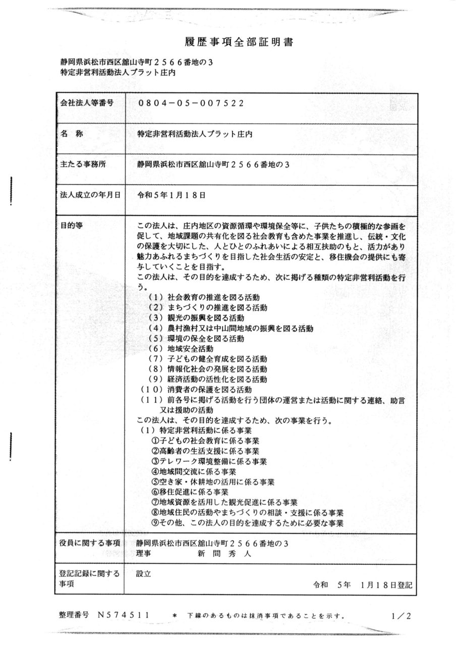 活動紹介 プラット庄内 法人設立 2023.01.25 本日、設立登記確認の謄本(履歴事項証明書)を頂いてきました。いよいよ本格的活動を進めて、地域の魅力あるまちづくりと「誇りが持てる故郷(いなか)づくり」に邁進します。