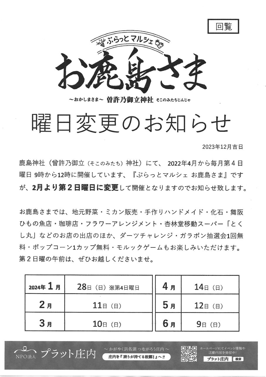 お鹿島さん開催日 曜日変更のお知らせ