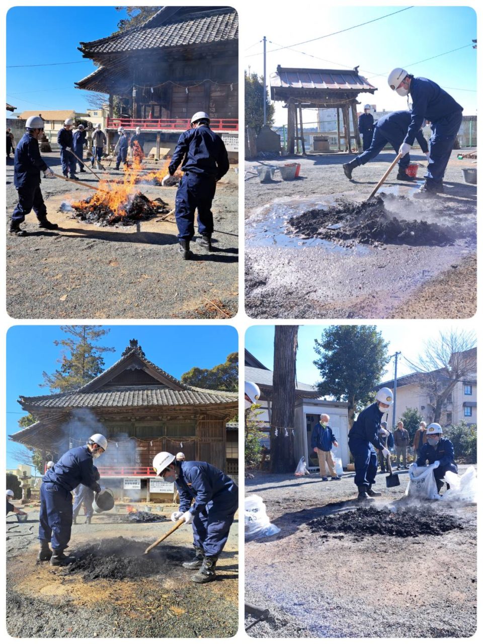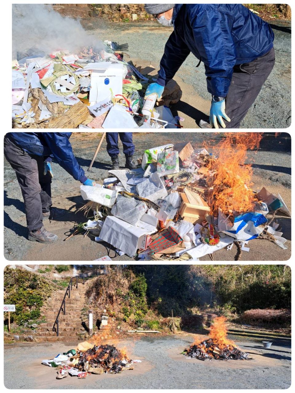 イベント・交流 舘山寺町「どんど焼き」 2023.02.06 浜松市西区舘山寺町の愛宕神社境内において「どんど焼き」が行われました。初めに舘山寺の舘住職による読経に続き神式の儀式を行い、聖観音菩薩様の見守る中で、年末にお迎えした歳神さまを煙や炎と共にお見送りして、今年の無病息災や五穀豊穣を願って、お正月のしめ飾りや昨年お世話になったお札等に火を入れました。