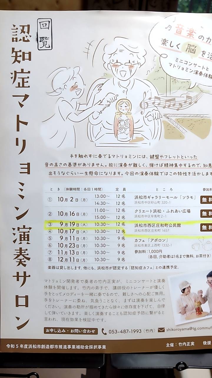 イベント・交流 認知症予防「マトリョミン」 2023.08.15 9月19日(火)、10月17日(火)西区庄和町公民館で、マトリョミン開発者であり演奏者の”竹内正実”さんによるミニコンサートと演奏体験を通して、その難しさを感じながら精神集中力を高める、認知予防対策として参加してみませんか?