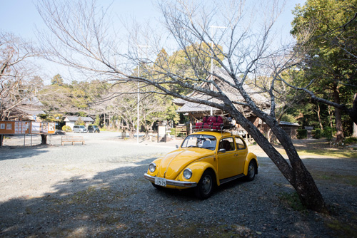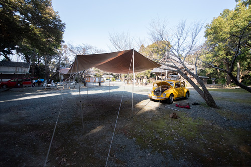 神社境内にメインタープを張ります。レクタタープLサイズですが、慣れると1人で張ることができます。