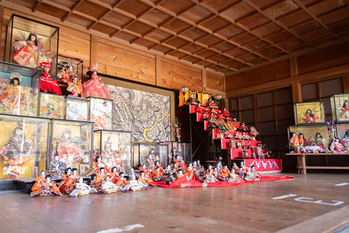 神社境内の舞台では、ひな人形が飾られていました。