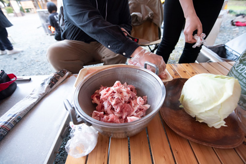 肉は2kg。庄内町の地元の方にネギと大根とキャベツをいただきました。