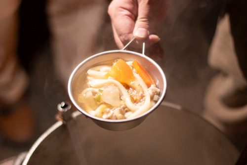 豚汁にうどんも入れて、神社炊き出し訓練特性豚汁うどんの完成!