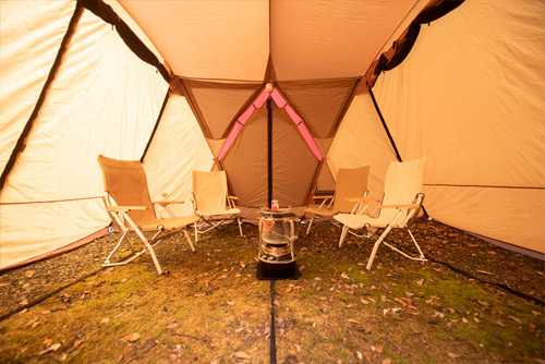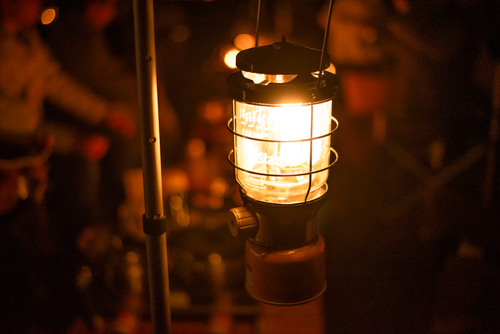 今回はLEDランタン、ガスランタンは最小にして、この灯油ランタンの明かりをメインに食事をしてみることにしました。