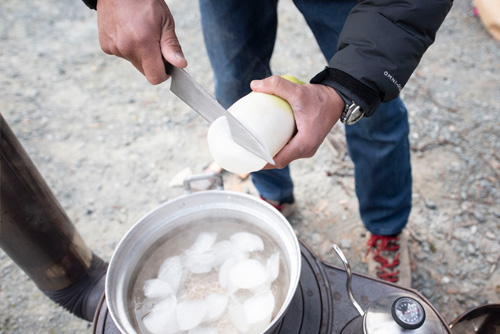宿泊家族以外に、神社さん関係者の方、氏子さん、近所の方などなど、人数が読めない中でしたが、薪ストーブでお湯を沸かして、みんなで食材を準備しました。
