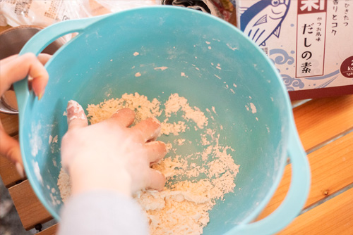 うどんは買い足すことができませんが、「すいとん」ならたくさん追加で作れます。みんなのおなかの様子を見ながら追加で作りました。すいとんは基本塩と小麦粉だけでも作れますが、今回は少し片栗粉も入れたり。粉で保存もききますし、人数に合わせて調整できますので、炊き出しメニューとしては優秀だなぁと思いました。
