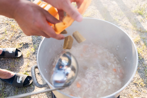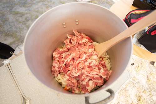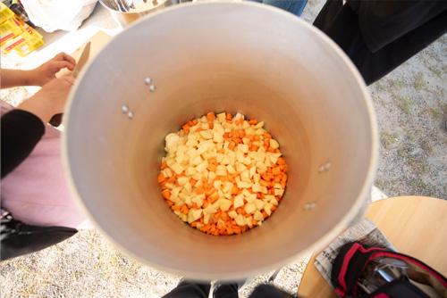 今回の防災キャンプとしては初めての試みで全員分の食事を寸胴でつくることに。