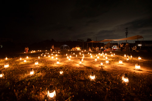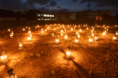 グラウンド一面に100台以上のランタンが並び、光の絨毯のよう。