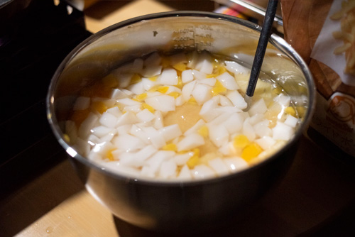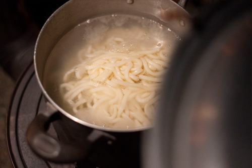 水は寸胴の2/3程。バーモントカレーは5箱を投入。その後、夜の部ではさらに1箱プラス水を入れてカレーうどんに。