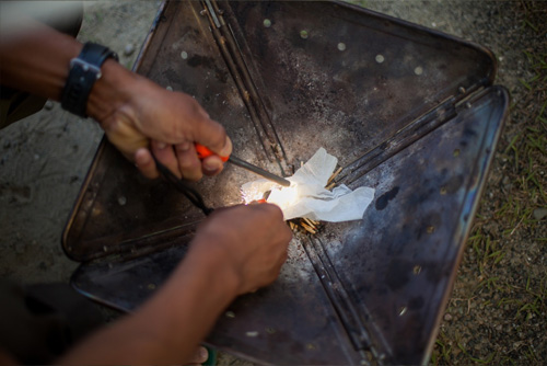 次は、火打石を使って火花→ティッシュ→新聞の順に大きな火をつくろう!