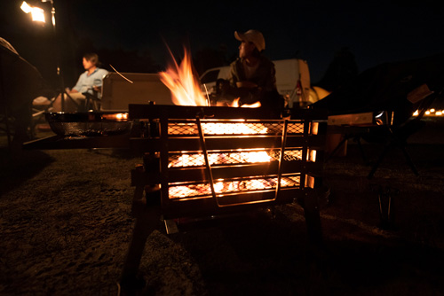 ↑の『アルファ化米おいしく食べようコンテスト』を行いつつ、夕食。バーベキューコンロは1つのみでみんなでシェアして炭の燃料を節約。材料はみんな持ち寄って、次から次へと焼いていきます。