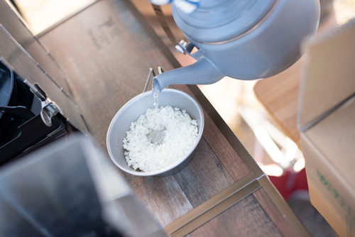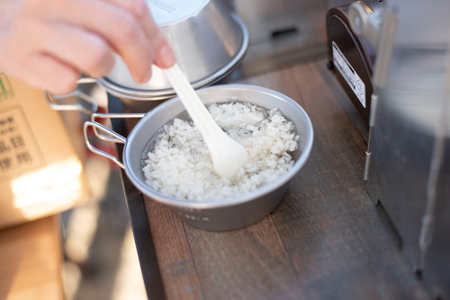 アルファ化米を小分けにした際は、シェラカップでコメ100ccの位置に対して、お湯を180ccの位置まで入れると水の量はいい感じ。
