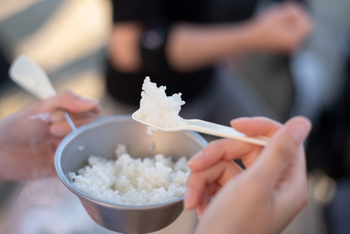 アルファ化米をどうやったらおいしく食べられるのかの今日の答えは、「普通に炊飯」+「焼肉等濃い目のおかず」+「外で食べる」+「みんなで食べる」が一番おいしく食べられるのかなと思いました。失敗しても「大丈夫だよ」って声をかけてもらえるし、みんなでいる安心感がよかったです。