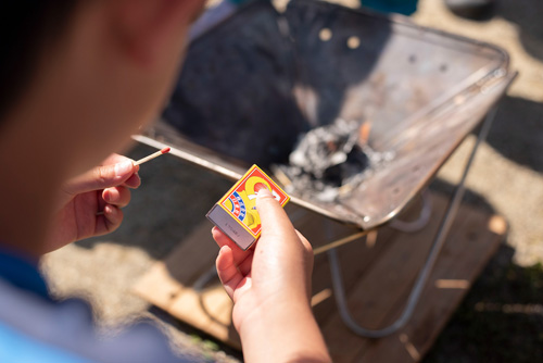 まずは懐かしいマッチ。子供たちは触ったことがなく、最初は火が付くとすぐに投げてしまいます。マッチはたくさあるので何回も練習しましたー。