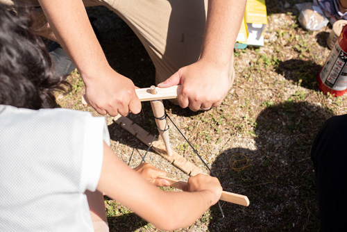 弓切り式の火起こしキットで火起こし体験。これは大人が必死!