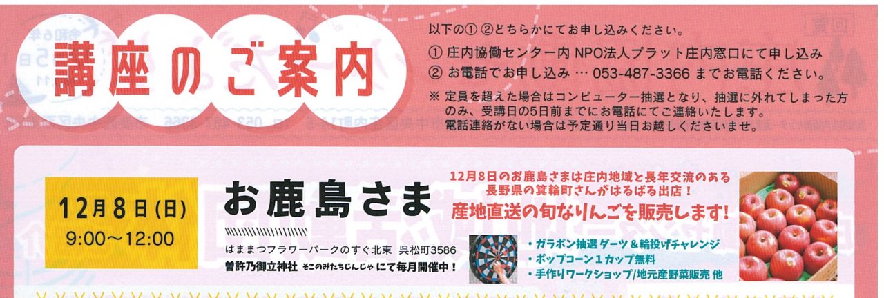 イベント・交流 12月度「お鹿島さま」緊急お知らせ! 2024.11.25 12月8日(第2日曜日)は、「お鹿島さま」・中央区呉松町3586曾許乃御立神社で毎月開催中のマルシェでは、長野県箕輪町より「りんご」が販売されます。(箕輪町の人が直接届ける特産品) 今月の回覧版にて案内いたしましたが、数量には限りがありますので、売り切れとなる事があります。よって早いお越しをお待ち致します。また、次回は、例年開催される2月の「庄内協働センターまつり」までお待ちいただく事となります。合わせて宜しくお願い申し上げます。