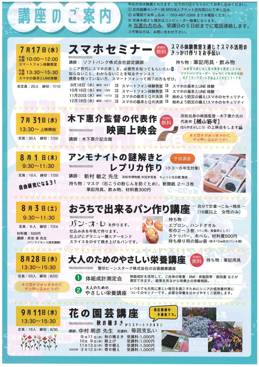 地元野菜直売、フリーマーケット、フラワーアレンジメント、つれづれ窯、アンモナイト化石展示、なるぴー珈琲、舞阪ひもの魚店、とくし丸、ガラポン抽選会、ダーツ、輪投げゲーム、モルック競技、ポップコーン、手作りハンドメイド店、庄内学園吹奏楽など