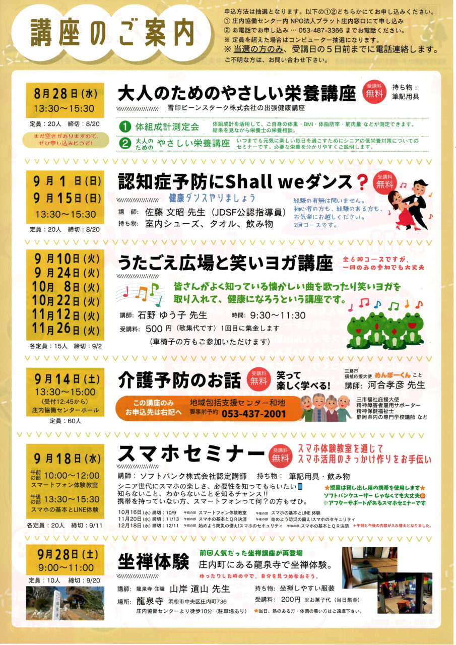 地元野菜直売、フリーマーケット、フラワーアレンジメント、つれづれ窯、アンモナイト化石展示、なるぴー珈琲、舞阪ひもの魚店、とくし丸、ガラポン抽選会、ダーツ、輪投げゲーム、モルック競技、ポップコーン、手作りハンドメイド店、庄内学園吹奏楽部、オイスカ浜松国際高等学校フラダンス部など
