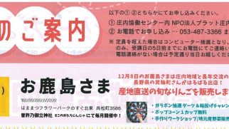 ぷらっとマルシェ「お鹿島さま」 1/12・2/9 毎月第2日曜はプラット庄内マルシェ「お鹿島さま」。浜松フラワーパーク近くの曾許乃御立(そこのみたち)1神社(鹿島神社)にて、9時から14時まで開催しています。お鹿島さまでは、お店・フリーマーケットのほか、神社の舞台での演奏もあり、毎月いろい... 2024.12.05 イベント・交流