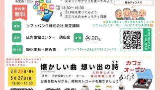 活動報告【懐かしい曲 想い出の詩】 2/20(金) 懐かしい曲 想い出の詩第3回目の開催、今回から大きなスクリーンにレコードジャケットを映し出してみました。耳からだけでなく視覚からも懐かしさ満載で大好評!今月から新たに来ていただいた方もいて、皆さんお茶を飲みながらゆったりと音... 2026.02.25 庄内協働センターの講座