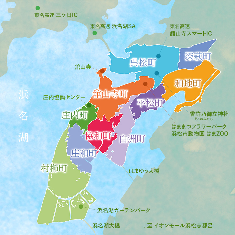 庄内地域は、全国でも有数の花き栽培(ガーベラ・菊など)の産地です。そのポテンシャルの高さから、これまでに「浜名湖花博」や「モザイカルチャー世界博」の舞台となってきました。 また、県内屈指の温泉街「舘山寺温泉」や、美しい自然を楽しめる娯楽施設が点在し、県内外から多くの人々が訪れる観光拠点としての顔も持っています。