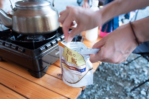 | 16時 | 夕食準備 焚火の上に大きな寸胴をおいて、豚汁+すいとんをみんなでつくりましょう! みんなで野菜を切ったりして準備します。 ご飯はラップに入れて湯煎で炊飯体験。同時にガスコンロでもご飯を炊いて食べ比べ。 |