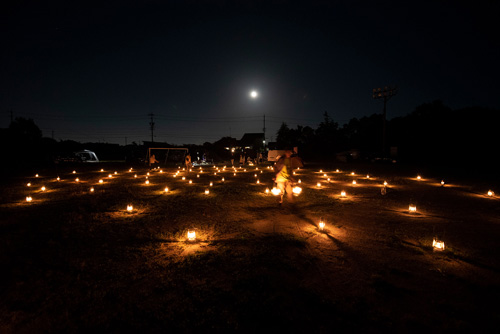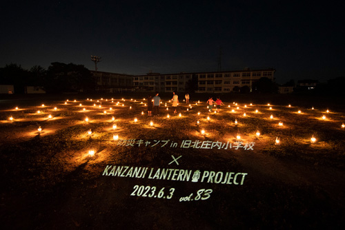 今回は地面にプロジェクターで投影。子供たちにも手伝ってもらって広いグラウンドにランタンを105台並べてみました!