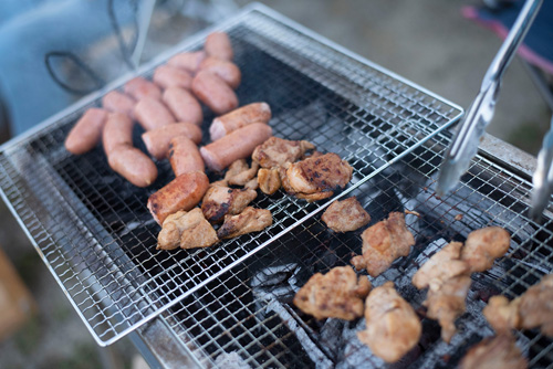 ↑の『アルファ化米おいしく食べようコンテスト』を行いつつ、夕食。バーベキューコンロは1つのみでみんなでシェアして炭の燃料を節約。材料はみんな持ち寄って、次から次へと焼いていきます。