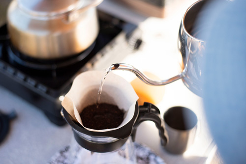 テントってカーテンがないですので、太陽と共に目覚めます。みんな徐々に起きて朝食。ホットサンドメーカーやパンなど。昨日焚火で焙煎したコーヒーを淹れていただきました。焚火の香りがする珈琲。すがすがしい朝の外で呑む焚火珈琲は最高!