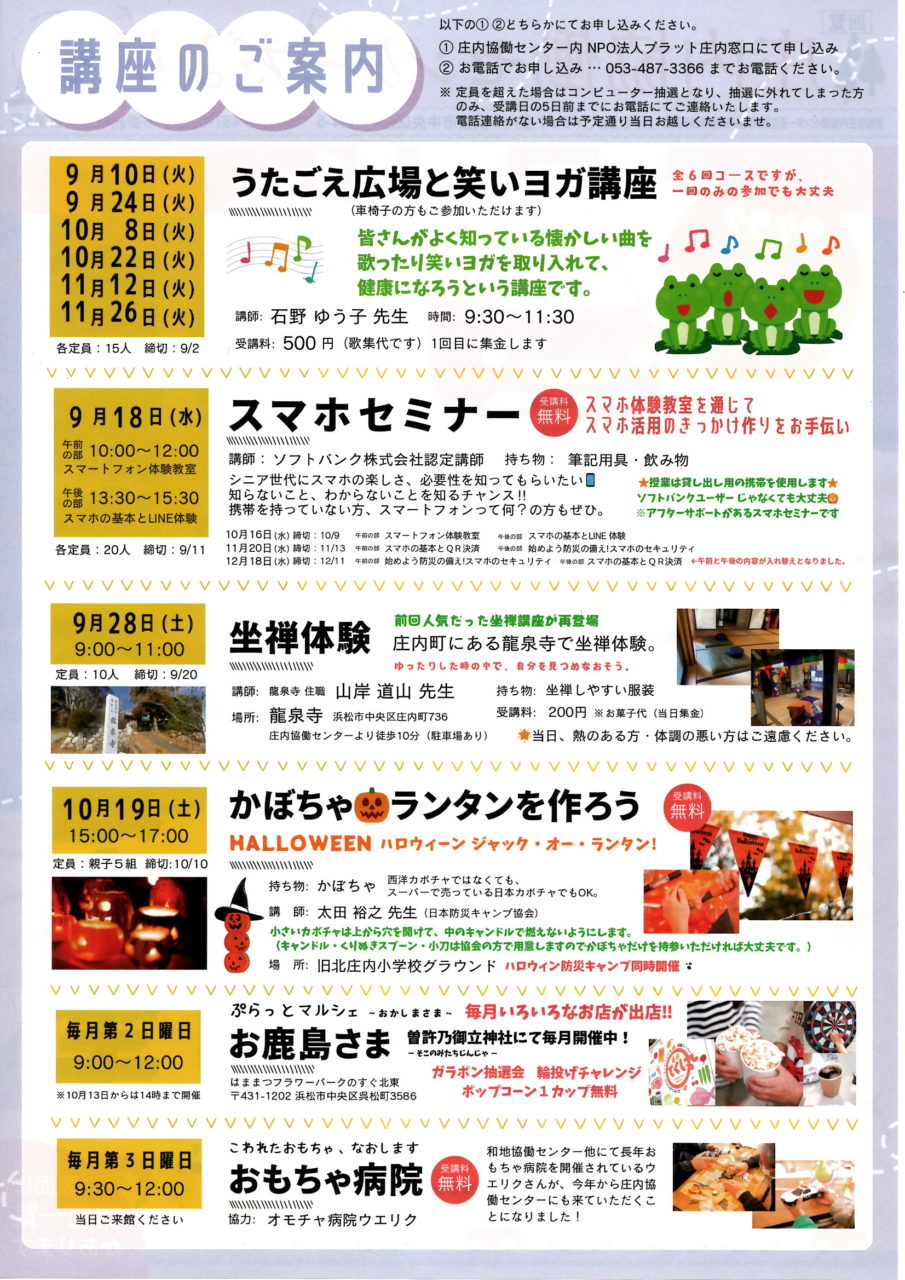 地元野菜直売、フリーマーケット、フラワーアレンジメント、つれづれ窯、アンモナイト化石展示、なるぴー珈琲、舞阪ひもの魚店、とくし丸、ガラポン抽選会、ダーツ、輪投げゲーム、モルック競技、ポップコーン、手作りハンドメイド店、庄内学園吹奏楽部、オイスカ浜松交際高等学校フラダンス部など
